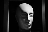 Wit aardewerk hoofd in frame uitgelicht met schaduwen tegen een zwarte achtergrond.