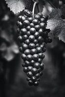 Deze prachtige zwart-witfoto van een tros druiven is een meesterwerk van minimalisme en elegantie. De druiven, perfect belicht en scherp in beeld, lijken bijna te gloeien tegen de donkere achtergrond. De subtiele details van de druivenschil en de bladeren voegen een extra dimensie toe aan het beeld. Dit kunstwerk is een tijdloze toevoeging aan elke ruimte en zal zeker de aandacht trekken van elke kijker.