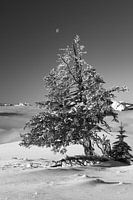 Zwart-witte conifeer met verse sneeuw in de winter en maan. Tannheimer dal, Oostenrijk, Schönkahler
