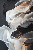 Een glinsterend samenspel van delicate, wuivende rookdraden ontvouwt zich in harmonieuze golven. De combinatie van helder wit en diepzwart creëert een fascinerend samenspel van contrasten, terwijl gouden accenten discreet door de zachte lijnen dansen. Deze visuele compositie trekt de kijker mee in een dromerige wereld van elegantie en rust.