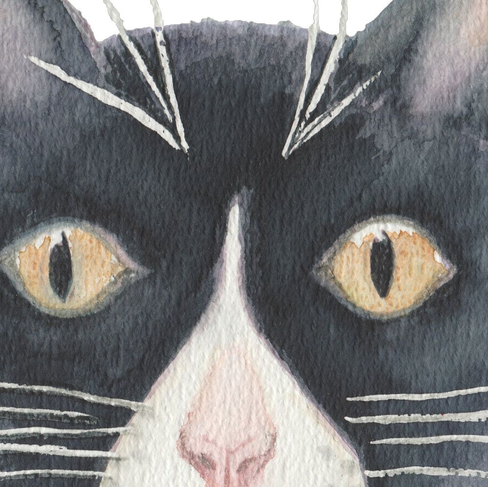 Vrolijk schilderijtje van zwart-witte kat.
