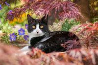 Schattige kat, tuxedo zwart-wit bicolor, Europees Korthaar, rustend onder een Japanse esdoorn in een bloemrijke tuin en nieuwsgierig kijkend