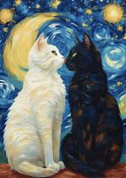 In een opvallende visuele compositie zitten een zwarte kat en een witte kat tegenover elkaar. Hun contrasterende vacht creëert een boeiend samenspel van licht en schaduw. De achtergrond is een abstracte mix van kleuren en vormen, die wervelen en samensmelten in een dynamische dans die de raadselachtige sfeer versterkt. De intense blikken van de katten sluiten elkaar in een moment van stille communicatie, wat een gevoel van nieuwsgierigheid en intrige oproept in deze droomachtige omgeving.