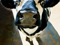 Dit schilderij brengt je letterlijk oog in oog met een koe, zo dichtbij dat je haar bijna kunt aanraken. De compositie is krachtig en direct: de grote snuit vult het beeld en trekt meteen alle aandacht. Zachte crème- en wittinten worden gecombineerd met diepe zwartblauwe accenten, terwijl subtiele aardse kleuren in de achtergrond zorgen…