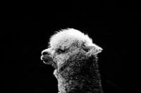 De krullen van een witte alpaca contrasteren sterk met de zwarte achtergrond en geven deze foto een dramatisch gevoel. Het hoofd van dit wollige beest steekt bijna naar voren, waardoor je hem een knuffel zou kunnen geven.