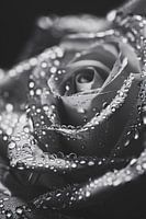 Ontdek de verfijnde schoonheid van deze zwart-witte foto van een roos, zorgvuldig bedekt met glinsterende dauwdruppels. De subtiele tinten van grijs versterken de delicate details van de bloemblaadjes, terwijl elke waterdruppel haarscherp is vastgelegd. Deze afbeelding straalt een tijdloze elegantie uit die perfect zou staan in elk modern of klassiek interieur. Een stijlvolle toevoeging aan uw woonkamer of kantoor, deze foto trekt gegarandeerd de aandacht en stimuleert gesprekken over de wonderen van de natuur en de kracht van subtiele kunst.