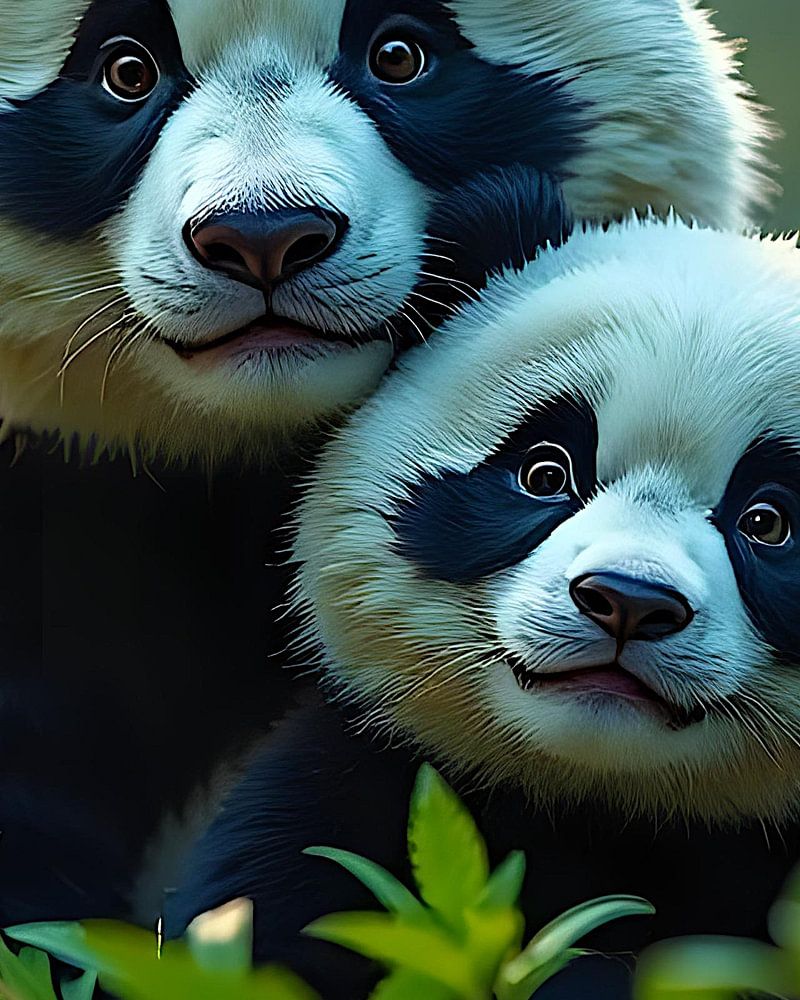 In deze betoverende close-up zien we een of drie panda's rusten en spelen in hun natuurlijke omgeving. De zachte, ronde gezichten van de dieren stralen een zorgeloze nieuwsgierigheid en vriendelijkheid uit. De karakteristieke zwart-witte vachtpatronen zijn goed te zien, waarbij het zachte, pluizige wit van het lichaam een mooi contrast vormt met de diepzwarte oogringen en oren.