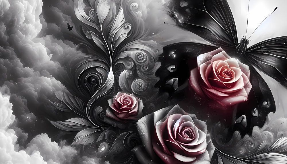 Dit kunstschilderij toont een elegante vlinder in zwart-wit, zwevend in een surrealistische wolkenlucht. Delicate roze rozen bloeien op zijn hoofd en vormen een fascinerend contrast met de monochrome kleuren van de vleugels en de lucht. De combinatie van zachte wolken en de fijne details van de vlinder geven het schilderij een kalme maar magische sfeer.