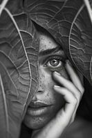 Dompel jezelf onder in de fascinerende samensmelting van mens en natuur met dit indrukwekkende zwart-wit portret. De smetteloze schoonheid van een vrouwengezicht, omlijst door gedetailleerde bladeren, trekt de kijker mee in een surrealistische wereld waarin de grenzen tussen natuur en mens vervagen. De fijn bewerkte sproeten en de intense diepte van de blik geven de foto een bijna hypnotiserende allure. Dit kunstwerk is ideaal voor liefhebbers van zwart-wit fotografie en surrealistische werelden. Het zal je zintuigen betoveren en een vleugje mysterie brengen in elke kamer.
