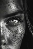 Dit opvallende zwart-wit portret vangt de ziel van een intense blik. De extreme close-up van een oog toont de fijne details van wimpers, irissen en sproeten, waardoor een bijna hypnotiserend effect ontstaat. De contrasterende tinten benadrukken de diepte en emotie van het moment. Dit werk is perfect voor liefhebbers van…