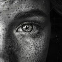 Dit opvallende zwart-wit portret vangt de ziel van een intense blik. De extreme close-up van een oog toont de fijne details van wimpers, irissen en sproeten, waardoor een bijna hypnotiserend effect ontstaat. De contrasterende tinten benadrukken de diepte en emotie van het moment. Dit werk is perfect voor liefhebbers van zwart-witfotografie en portretten en zal elk interieur verrijken met een krachtige visuele aanwezigheid.