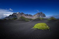 Een van de mooiste stranden van IJsland, onder een prachtige blauwe hemel.