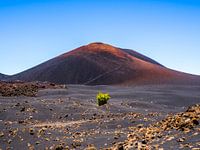 Eenzaam boompje omringd door zwart en rood vulkanisch zand op Tenerife