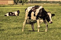 Nederlandse Zwartbont koeien in het weiland. Genieten van het verse gras. Vrede op aarde. Een Fries-Hollands rund. Typisch gezicht in Nederland.