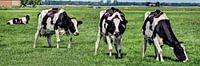 Nederlandse Zwartbont koeien in het weiland. Genieten van het verse gras. Vrede op aarde. Een Fries-Hollands rund. Typisch gezicht in Nederland.