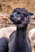 Haarscherpe close-up foto van een zwarte alpaca. Hij houdt zijn hoofd schuin maar kijkt recht in de camera. Door zijn blik in zijn ogen, het lange haar met stro erin en het haar voor zijn ogen krijgt de Alpaca een eigenwijze schattige uitstraling. Je zou het beest zo een knuffel willen geven!