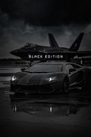 De 'Black Edition' Lamborghini Aventador staat laag op een regenachtige landingsbaan, gekoppeld aan een stealth straaljager. Zijn matte afwerking en scherpe, aerodynamische lijnen weerspiegelen een gedeeld DNA van snelheid en geavanceerde techniek. Pure stealth uitmuntendheid."