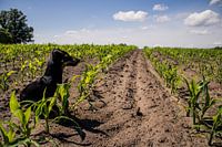Zwarte Jack Russell in een maisveld in het voorjaar