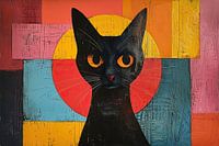 Zwarte Kat | Zwarte Kat - Op dit schilderij zie je een zwarte kat met grote, vurige ogen, die wordt omringd door een kleurrijke achtergrond van vakken in verschillende tinten, wat zorgt voor een modern en levendig gevoel.