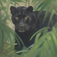 Een kleurrijk digitaal schilderij van een zwarte panter omringt door bladeren in het oerwoud. Het werk geeft een dromerige en klassieke uitstraling aan uw interieur!