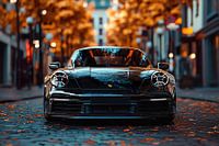 Een stijlvolle poster met een zwarte Porsche 911 GT3, glanzend in zacht avondlicht. Geparkeerd op een natte, straat in een moderne omgeving, met lichten die subtiel op de lak dansen. De lucht is half donker, met een mysterieuze gloed van de achtergrond. De perfecte mix van kracht, luxe en elegantie in een adembenemend beeld.