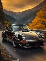 Een imposante zwarte Porsche staat in contrast met de herfsttinten van de bergachtige omgeving. De bergtoppen vormen een majestueuze achtergrond, terwijl de sportwagen de kracht en elegantie van de natuur weerspiegelt. Een samenspel van kracht, snelheid en serene schoonheid temidden van adembenemende landschappen.