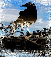 Grunge digitaal kunstwerk van een zwarte raaf in een collag met een bos en brug verwerkt als textuur.