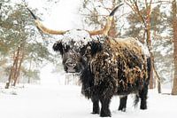 Portret van een Schotse Hooglander in de sneeuw tijdens de winter. De Schotse Hooglanders worden ingezet bij het natuurbeheer op de Veluwe om ervoor te zorgen dat heidegebieden niet dichtgroeien.