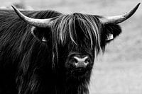 Een zwart wit portret van een zwarte Schotse hooglander. Dit portret is genomen in een weiland in Oostenrijk.