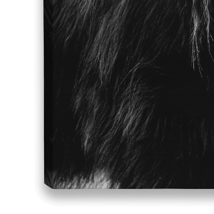 Een vierkant zwart wit portret van een Schotse hooglander. Dit portret is genomen in een weiland in Oostenrijk.