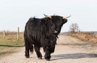 Een jonge zwarte Schotse Hooglander in natuurgebied Huis ter Heide in De Moer in Nederland. Het gebied wordt beheerd door Natuurmonumenten.
