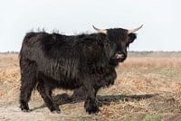 Een jonge zwarte Schotse Hooglander in natuurgebied Huis ter Heide in De Moer in Nederland. Het gebied wordt beheerd door Natuurmonumenten.