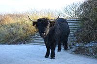 Deze jonge zwarte Schotse Hooglander zag ik in de winter tijdens een wandeling. Nadat we elkaar even in de ogen gestaard hadden liepen we weer verder. Een mooie ontmoeting,