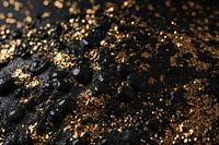 Dit intrigerende ontwerp vangt de blik met zijn luxe uitstraling. De gouden glitters die zijn verspreid over het ruwe, zwarte oppervlak geven het een exclusief karakter. Het spel tussen licht en schaduw creëert een dynamische maar tegelijkertijd subtiele schoonheid die zich niet meteen volledig prijsgeeft. Het is een ontwerp dat zowel moderniteit als tijdloze klasse belichaamt en zou niet misstaan in een verfijnde woonkamer of een stijlvol kantoor. De diepe zwarttinten contrasteren sterk met de warme gouden schitteringen, wat leidt tot een harmonie die zowel rust als fascinatie brengt. Deze compositie is een ode aan minimalisme met maximale impact; een ware blikvanger die de ruimte omtovert tot een galerij van persoonlijke expressie.