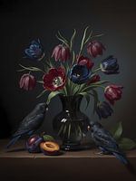 Zwarte Tulpengaaien is een verstild schilderij uit de collectie Vogels en Bloemen, geïnspireerd op de 17e-eeuwse Hollandse schildertraditie, waarin eenvoud, licht en balans centraal staan. De compositie is minimalistisch en ruim opgezet, met veel negatieve ruimte en een zachte, subtiele lichtval die het geheel een rustige, bijna…