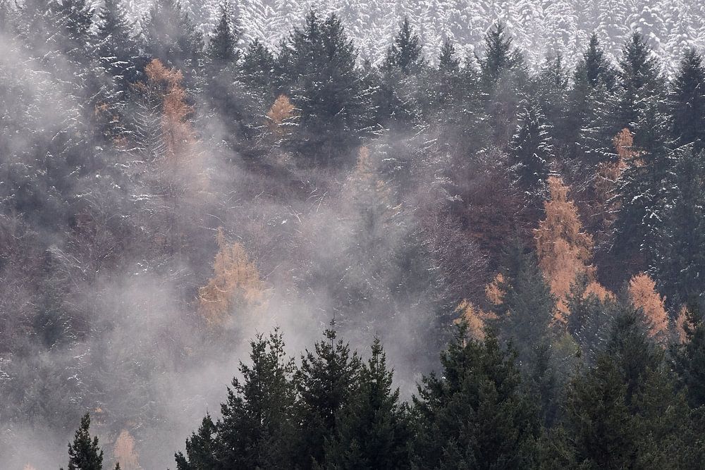 Eerste sneeuw in het Zwarte Woud op een mistige dag, Geroldsau, Duitsland.