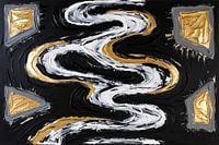 Dit intrigerende abstracte kunstwerk combineert vloeiende, dynamische lijnen met contrasterende kleuren van zwart, wit, en goud. De centrale focus ligt op een kronkelende vorm, die doet denken aan een rivier of stromende energie, die door het schilderij meandert. De geometrische elementen in de hoeken voegen een verrassend detail toe, wat het geheel een modern en verfijnd uiterlijk geeft. Met een krachtige visuele impact past dit ontwerp perfect in een hedendaags interieur, bijvoorbeeld in een slaapkamer of kantoor. De combinatie van de kleuren en texturen zorgt voor een dynamisch contrast dat de ruimte direct levendiger maakt. Dit schilderij is een geweldige keuze voor wie op zoek is naar een unieke toevoeging aan zijn of haar moderne inrichting.