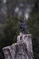 Een zwarte currawong kijkt op met zijn gele ogen terwijl hij op een boomstronk tussen wat struiken zit. We zagen deze mooie currawong tijdens onze wandeling terug naar onze hut na een trektocht in de buurt van Cradle Mountain, Tasmanië, Australië.
