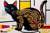 Dit levendige ontwerp toont een sierlijke zwarte kat in een kleurrijke, moderne Pop Art-stijl. Het gebruik van gedurfde lijnen en felle kleuren zoals geel, roze, en oranje zorgt voor een opvallend contrast tegen de zwarte vacht van de kat. De blauwe ogen van de kat trekken meteen de aandacht en geven het geheel een speelse uitstraling. Het geometrische patroon dat de kat bedekt, versterkt het dynamische en hedendaagse gevoel van het kunstwerk. Dit stuk zou perfect passen in een moderne ruimte zoals een woonkamer of kantoor, waar het een blikvanger zou zijn die energie en creativiteit toevoegt. Een ideaal kunstwerk voor kattenliefhebbers of iedereen die houdt van een gedurfde en kleurrijke stijl.