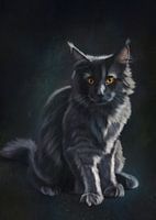 Een zwarte kat op een donkere achtergrond, maar door de belichting komt de kat zo mooi uit.