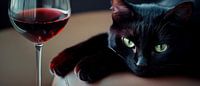 Een mysterieus samenspel van donkere vacht en glanzende ogen geeft deze kat een uitstraling van elegantie en rust. Samen met het glas rode wijn straalt het tafereel gezelligheid en stijl uit, ideaal voor een moderne woonkamer waar ontspanning en conversatie centraal staan. Een echte blikvanger voor alle kattenliefhebbers!