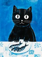 Zijn de sardientjes voor de kat? Het maakt haar niet uit: bon appétit. Een leuk schilderij in zeeblauw voor alle tolerante kattenliefhebbers.