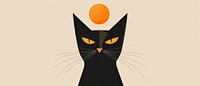 Een fascinerend portret van een mystieke zwarte kat, wiens intense blik en de fel oranje zon boven zijn hoofd een mysterieuze sfeer creëren. De minimalistische vormen en zachte kleuren maken dit kunstwerk perfect voor een moderne woonkamer of creatief kantoor, waar het de verbeelding kan prikkelen.