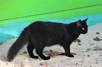 Koop de foto Zwarte kat op Bonaire. van Silvia Weenink als print op canvas, aluminium dibond, (ingelijste) fotoprint, behang en ArtFrame. Voor jou op maat geprint in Fine-Art kwaliteit.