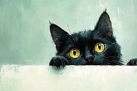 Een nieuwsgierige zwarte kater tuurt met grote, glanzende ogen over een richel. Zijn fluwelen vacht lijkt te contrasteren met de zachte, lichtgroene muur, terwijl zijn pootjes zich teder vastklampen aan de bovenrand. Hij is speels en mysterieus, alsof hij het geheim achter de muur verkent.