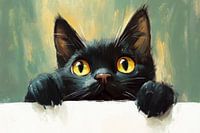 Met fonkelende gouden ogen en een nieuwsgierige uitdrukking tuurt een zwarte kat ondeugend over een rand. Haar zachte, fluwelen pootjes grijpen de rand vast alsof ze klaar is om de wereld daarachter te verkennen. De zachte, groene achtergrond versterkt de mysterieuze flair die haar omringt - een spel van schaduw en licht.