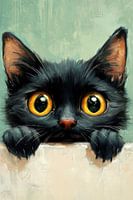 Met grote, sprankelende ogen tuurt een nieuwsgierig zwart katje over een rand alsof het een geheim avontuur aanschouwt. Zijn zachte, glanzende vacht en spitse oren geven hem een aantrekkelijke charme. Deze kleine ontdekkingsreiziger straalt een mengeling van onschuld en speelsheid uit die meteen het hart verovert.