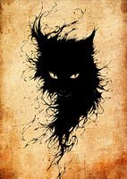 De afbeelding toont een silhouet van een zwarte kat met doordringende gele ogen, weergegeven in een dramatische inktstijl. De vacht van de kat is afgebeeld met ingewikkelde, vloeiende lijnen die een gevoel van beweging en energie creëren. De achtergrond is van oud perkamentpapier met textuur, wat een vintage en mysterieus gevoel…