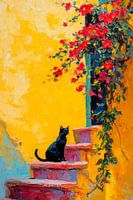 Een warme gele kleur omhult het tafereel, terwijl felrode bloemen zich zachtjes een weg naar boven kronkelen. Een zwarte kater zit majestueus op de trap en geniet van het moment. Deze harmonieuze compositie van kleuren en vormen nodigt uit tot dromen en dompelt de kijker onder in een kalme, mediterrane sfeer.