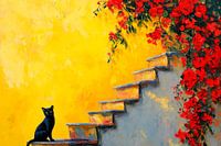 Een zwarte kater zit trots op een trede, zijn mysterieuze blik steekt fel af tegen de felgele kleur van de muur. Felrode bloemen verstrengelen zich boven hem en geven het tafereel een magisch tintje. Deze compositie van kleur en vorm roept een gevoel van rust en tegelijkertijd van verborgen avonturen op.